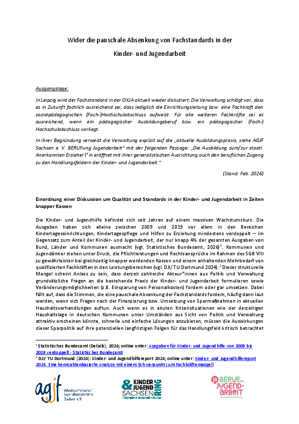 Die pauschale Absenkung von Fachstandards als Lösungsversuche für die multiple Problem- und Mangellage (insbesondere die fiskalische Lage in sächsischen Kommunen) in der Kinder- und Jugendarbeit lehnen wir als Dachverbände weiterhin entschieden ab. Nicht nur gefährdet sie die Qualität der Angebote massiv und hat damit direkten negativen Einfluss auf die Bedingungen im Aufwachsen von Kindern und Jugendlichen, sie setzt auch Fachkräfte im Handlungsfeld weiter unter Druck.